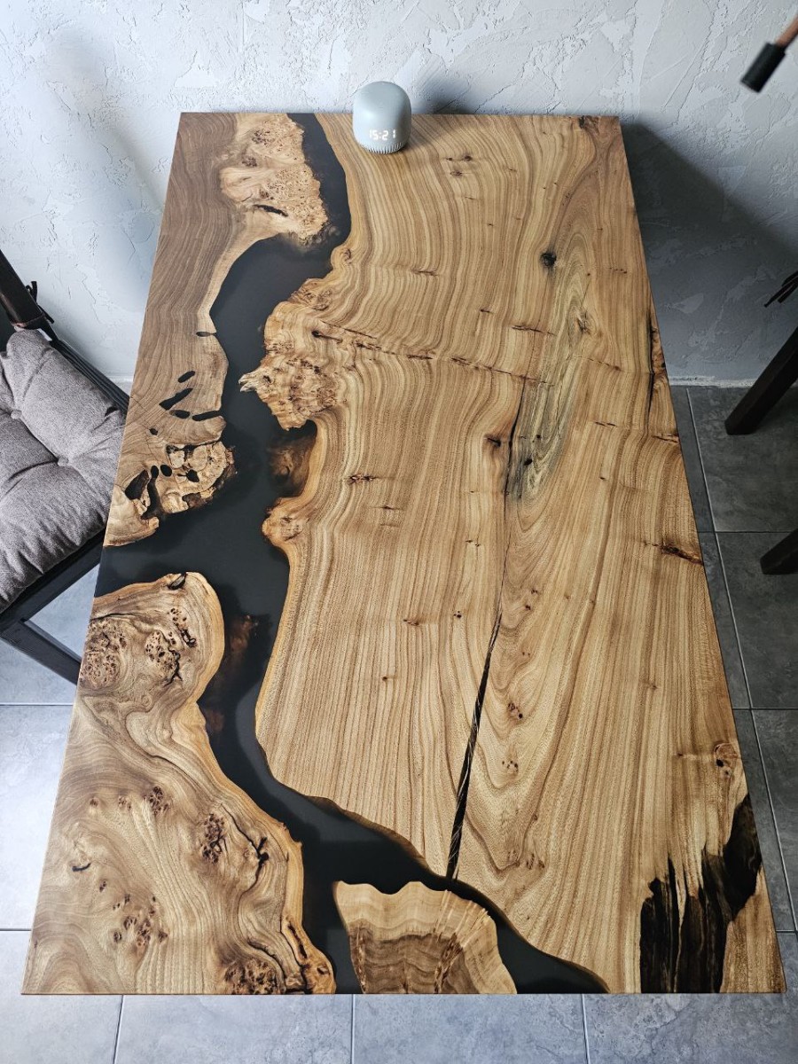 Стол выполнен из слэба Карагача и отдельных Капов. Подстолье собрано из ясеня, так как он максимально подходит к Карагачу. Заботливо отшлифован и залит эпоксидной смолой с темным цветом.